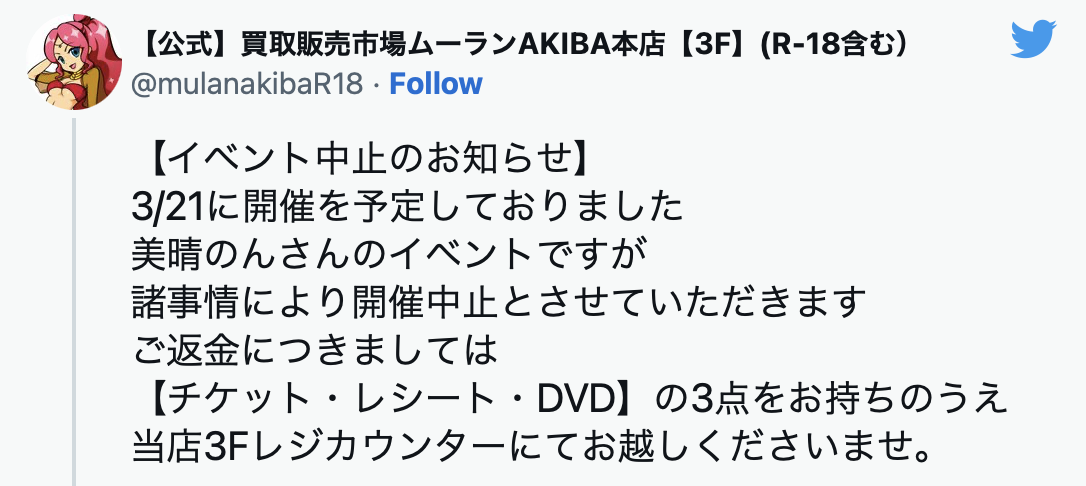 这已经有点怪怪的,但还没完喔,在宣布YouTube直播后的两天,也就是3月10日的时候,美晴のん(美暖暖)开开心心地在twitter宣布要举行出道以来第一次的实体活动,要在3月21日的时候和大家见面,然后ー